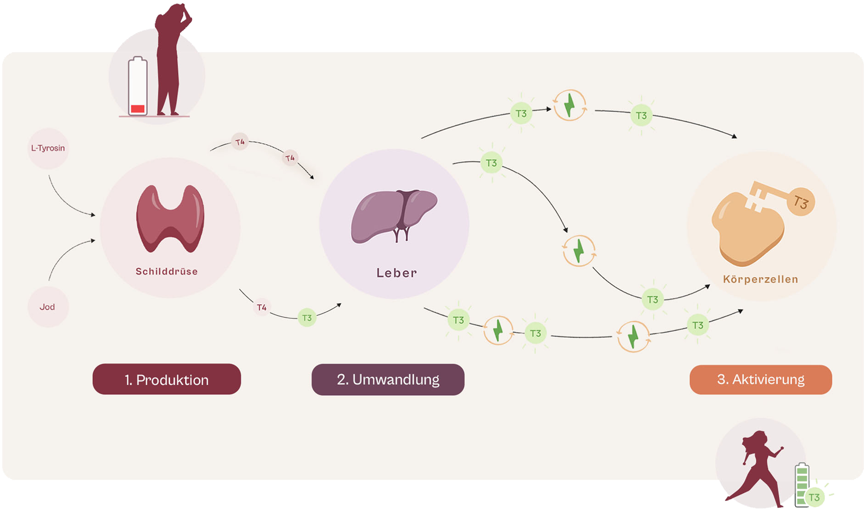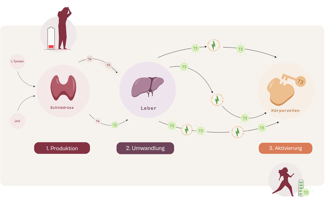 Die Schilddrüse produziert zwei wichtige Hormone: T4 (eine inaktive Vorstufe) und T3 (die aktive Form). Damit dein Stoffwechsel gut funktioniert, muss das T4 zuerst in T3 umgewandelt werden.