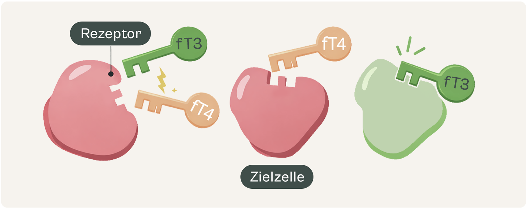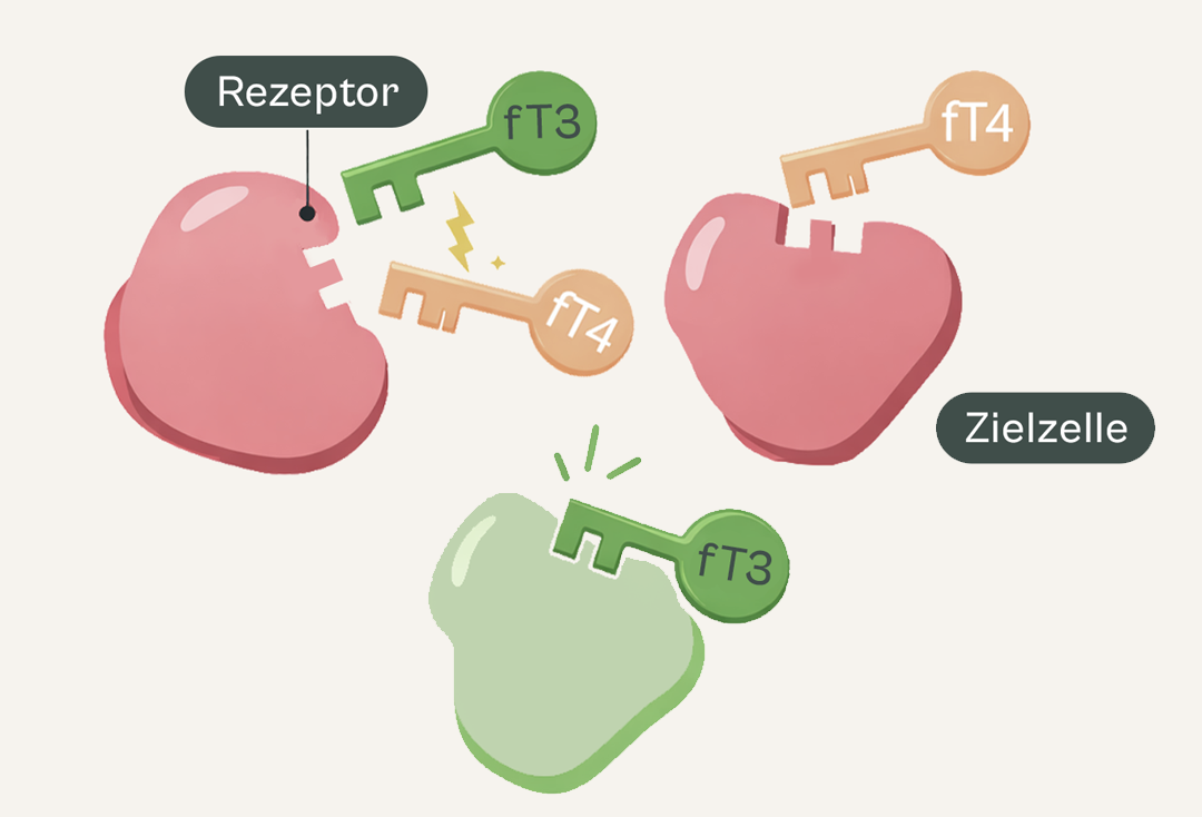 Denn nur das aktive Hormon T3 passt wie ein Schlüssel exakt in das Schloss deiner Zellen. T4 dagegen ist nur die Vorstufe. Fehlt deinem Körper also der richtige Schlüssel, befindest du dich im Energiesparmodus.