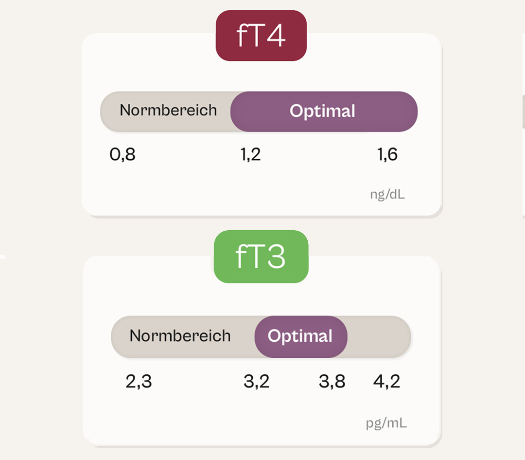 Ein Wert bei 20 % fühlt sich ganz anders an als einer bei 85 %, so wie gemütliches Schlendern nicht dasselbe ist wie ein kraftvoller Sprint. In der nachfolgenden Abbildung siehst du den Unterschied zwischen Normbereich (beige) und Optimalbereich (lila) für fT3 und fT4.